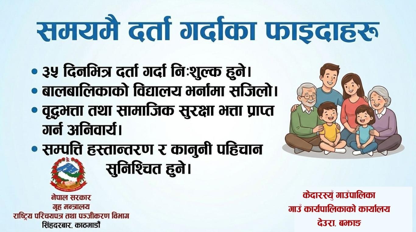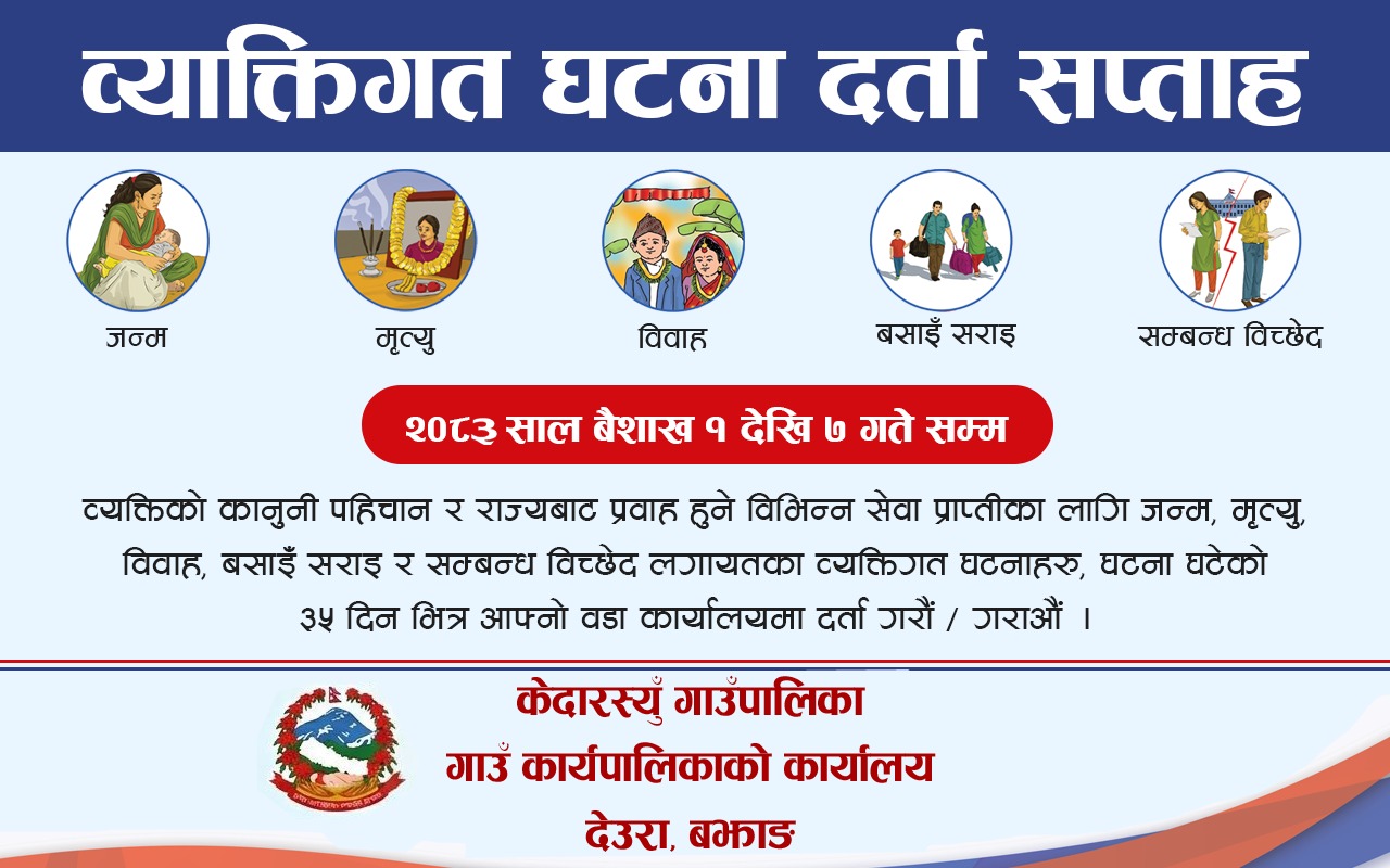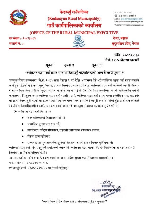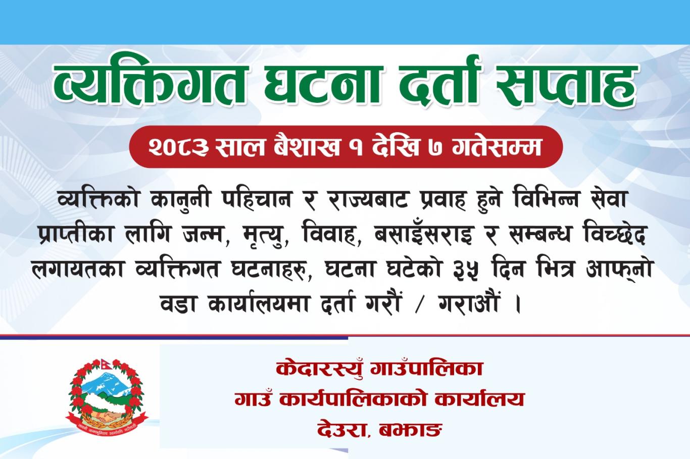 व्यक्तिगत घटना दर्ता सप्ताह सम्बन्धी केदारस्युँ गाउँपालिकाकाे सूचना ।